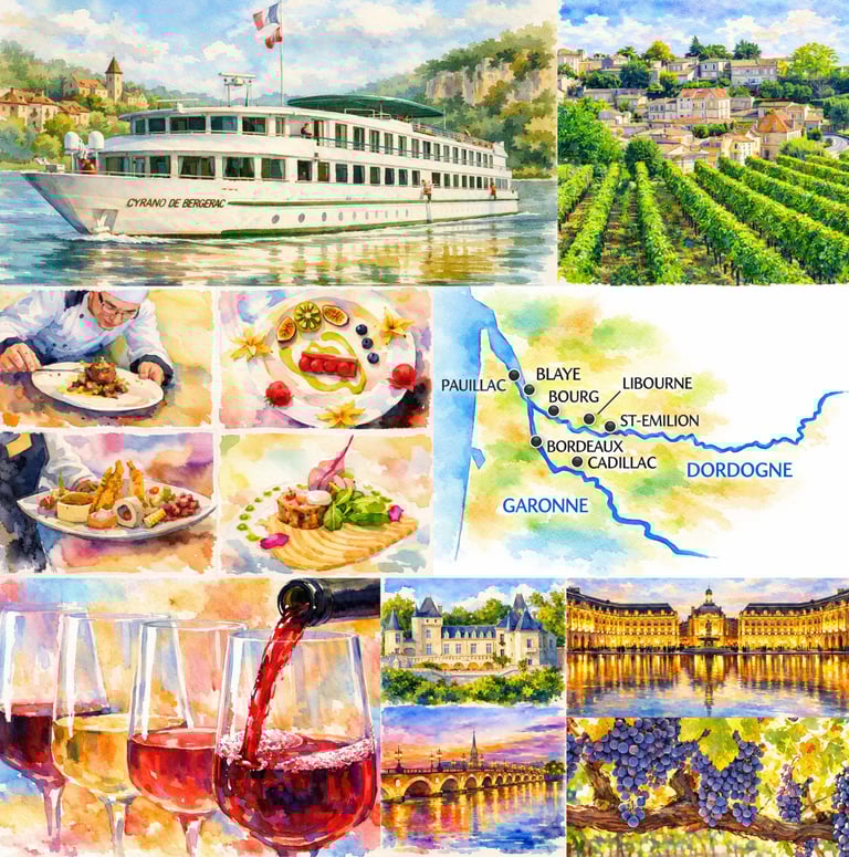 Langs de rolige, historietunge elvene Garonne og Dordogne folder Bordeaux-regionen seg ut som et levende maleri av vinmarker, slott og tidløs fransk eleganse. Her glir du stille gjennom landskap der vinrankene har stått som tålmodige vitner i århundrer, og hvor hver sving i elven avslører nye skatter – fra majestetiske festningsbyer til søvnige landsbyer med brostein og klokketårn.